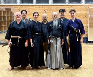 Trotz seiner ansonsten sehr freundlichen Art, ist Hamamoto Sensei beim Training sehr aufmerksam. Seinen Augen entgeht nichts und an den ersten Trainingstagen erschien er unglaublich streng und fordernd. Die Art und Weise, Obi und Hakamaknoten zu binden war mir neu, ebenso wie Noto und Chiburi (das Wegstecken des Schwertes) oder gar das Ziehen (Nukitsuke) des Schwertes auszuführen sind. Jede Bewegung ist darauf bezogen, sich stets zu schützen oder die Klinge blitzschnell wieder frei zu bekommen, falls der zu Boden gebrachte Gegner doch noch einmal zum Schnitt ansetzt. 22 Kata gespickt mit mir unbekannten technischen Feinheiten prasselten auf mich ein. Entsprechend oft schaute ich Hamamoto Sensei einfach nur verwirrt an, anstatt seinen Katabewegungen zu folgen. Meine schwachen Kenntnisse der japanischen Sprache halfen kaum weiter.
